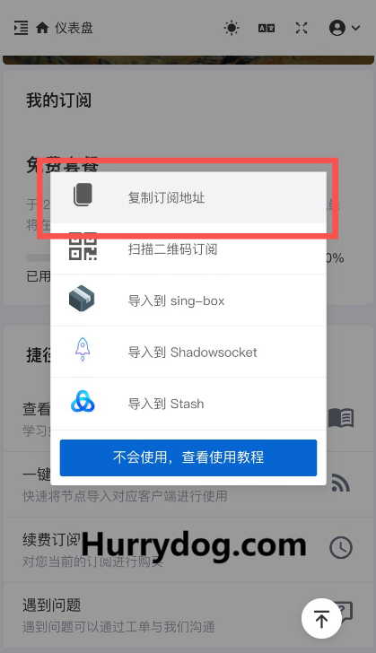 登录机场后台,找到「一键订阅」按钮并点击。点击复制订阅地址,准备好将其导入到 Potatso for iOS 中。