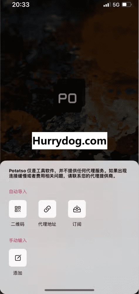 打开 Potatso for iOS 客户端,点击下方的「添加代理」选项,然后选择「订阅」。
