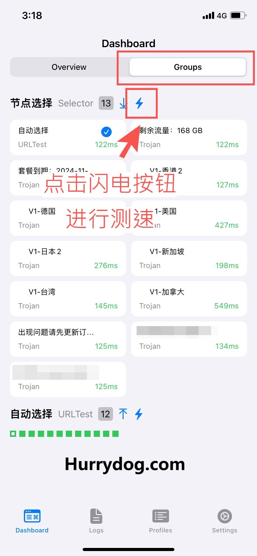 点击「Groups」,然后按下闪电按钮进行测速,接着选择合适的节点开始使用。