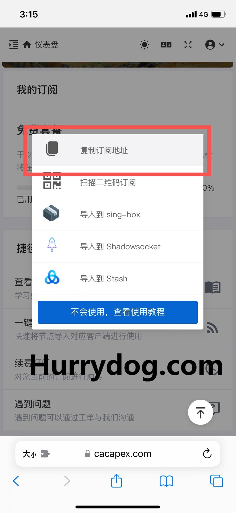 登录机场后台,找到「一键订阅」按钮并点击。点击复制订阅地址,准备好将其导入到 Sing-Box for iOS 中。