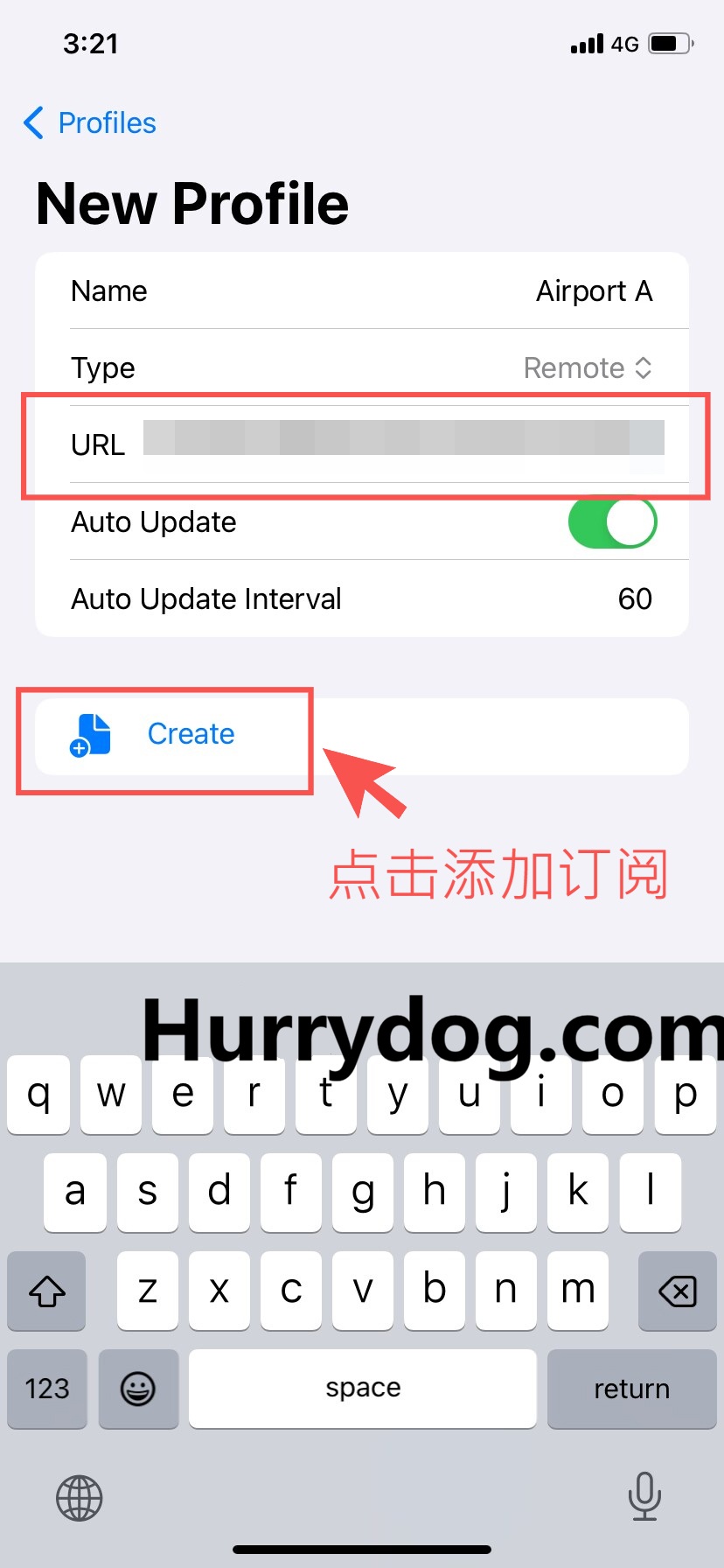 打开Sing-Box for iOS客户端,点击下方的「Profiles」,然后点击「添加」。将复制的订阅地址粘贴到URL栏,完成后点击「Create」添加订阅。