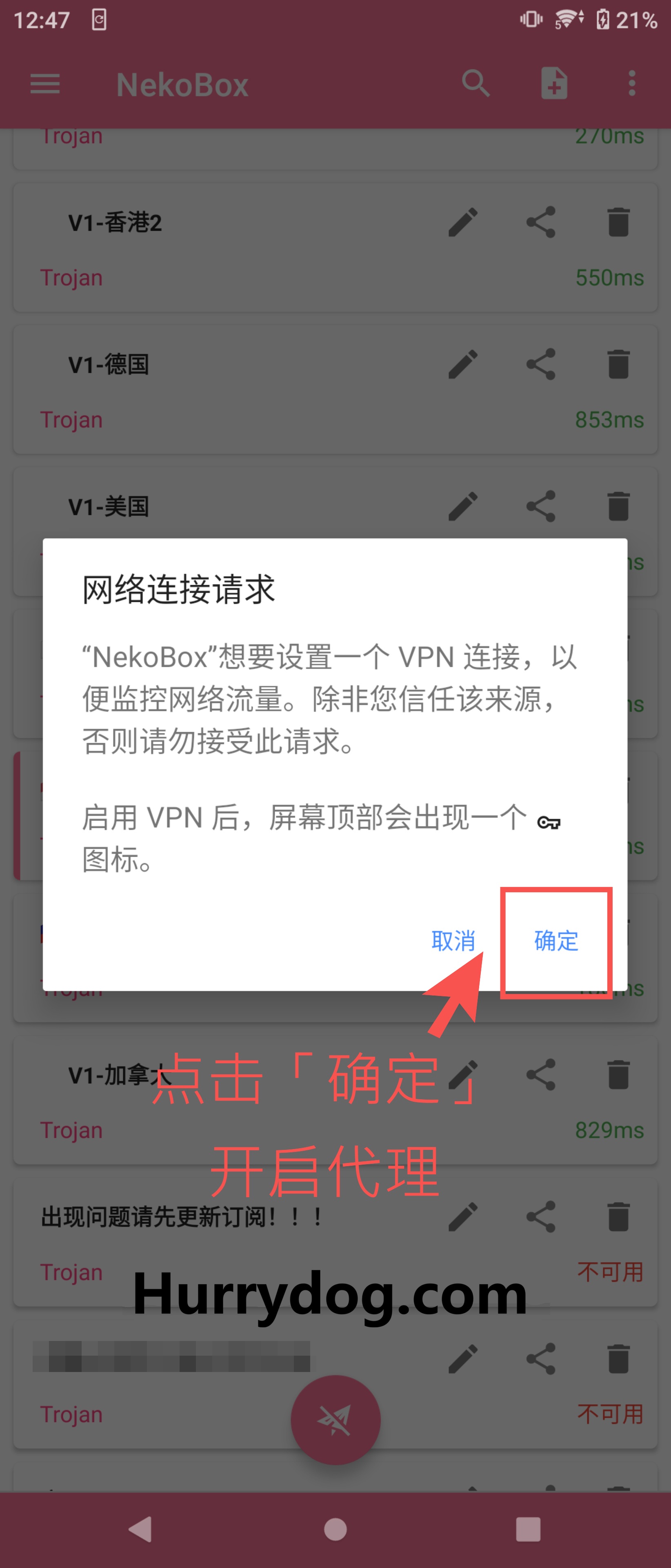 第一次开启时,系统会弹出是否允许开启VPN,点击「确定」即可。