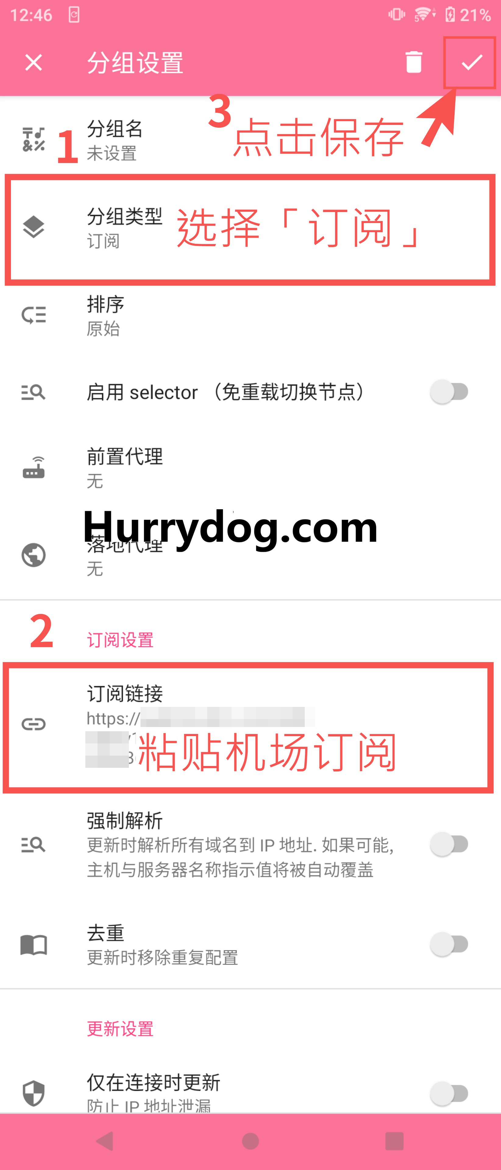 点击右上角,选择分组类型为「订阅」,粘贴机场订阅地址,然后点击右上角保存配置。
