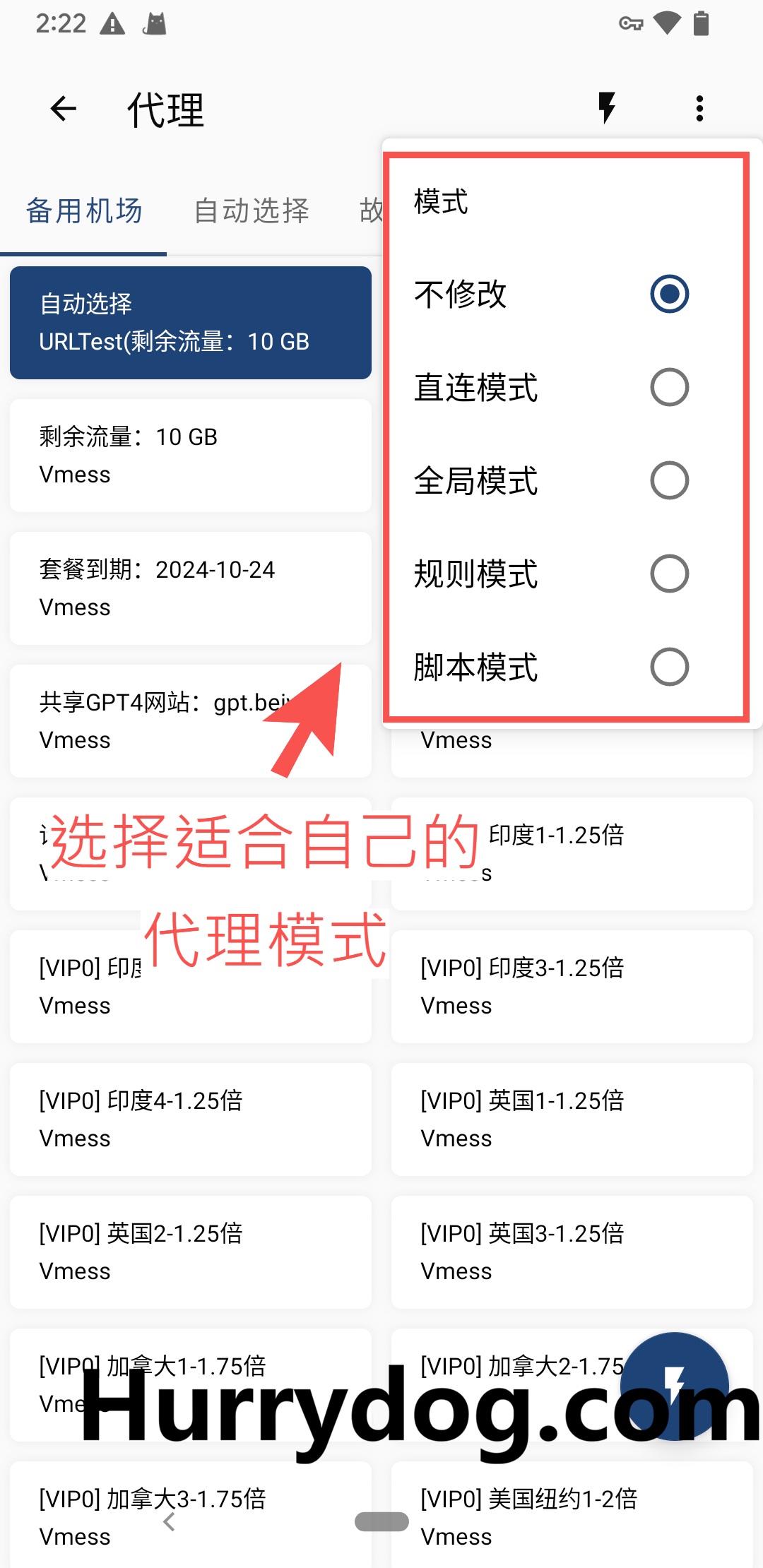 接下来,您可以在「代理」窗口中进行延迟测试,以检查每个节点的连通性。若节点后面显示数字,表示节点正常。您还可以根据需求选择不同的代理模式: