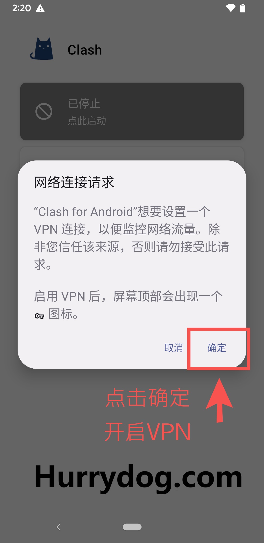 点击顶部的「已停止」按钮,首次打开时,系统会提示您是否允许开启 VPN,点击「确认」。