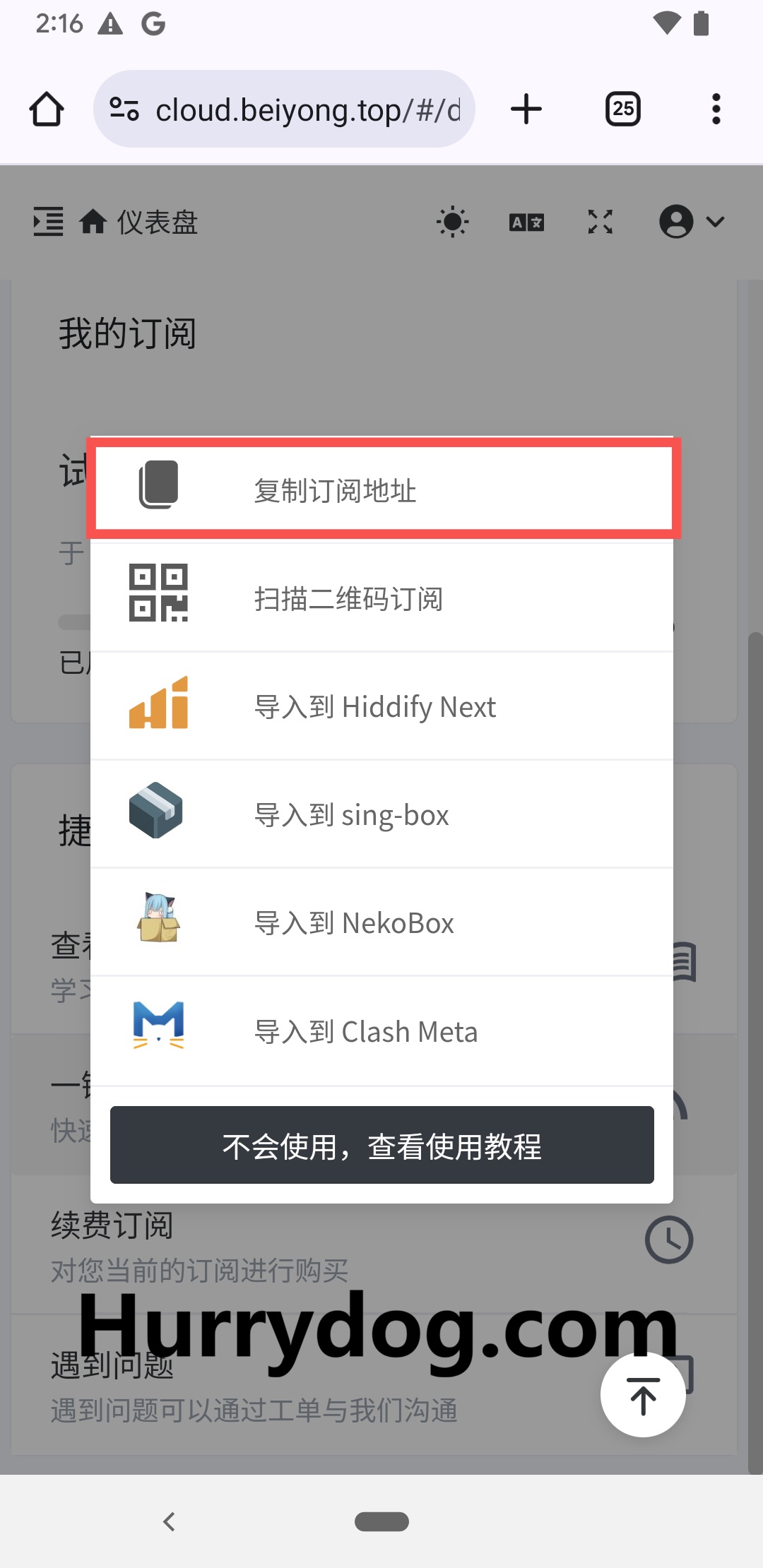 登录机场并点击「一键订阅」,然后复制订阅地址。